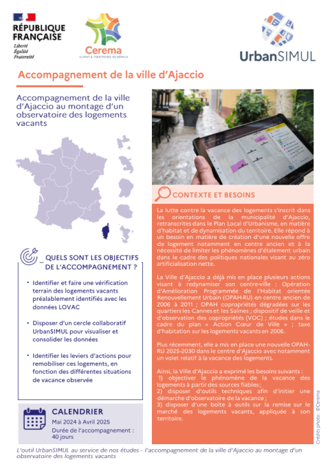 Face aux enjeux d’accès au logement et de revitalisation de son parc existant, la ville d’Ajaccio a engagé une démarche visant à mieux connaître et suivre les logements vacants présents sur son territoire. Pour accompagner cette démarche, la collectivité a mobilisé l’outil UrbanSIMUL avec l’appui du Cerema afin de structurer un observatoire local de la vacance. Cette initiative vise à améliorer la connaissance du phénomène de vacance et à identifier des leviers d’action pour favoriser la remise sur le marché de ces logements.
